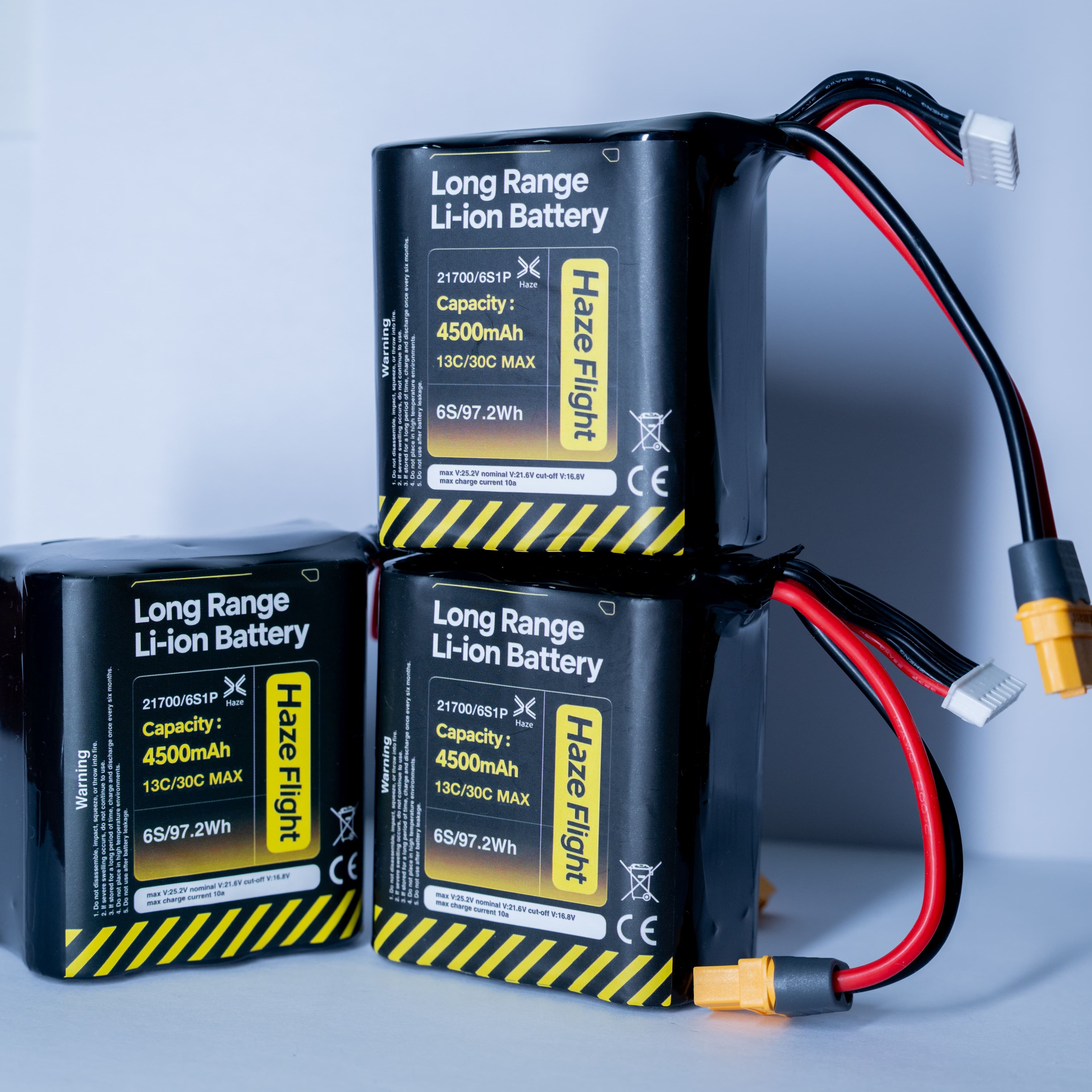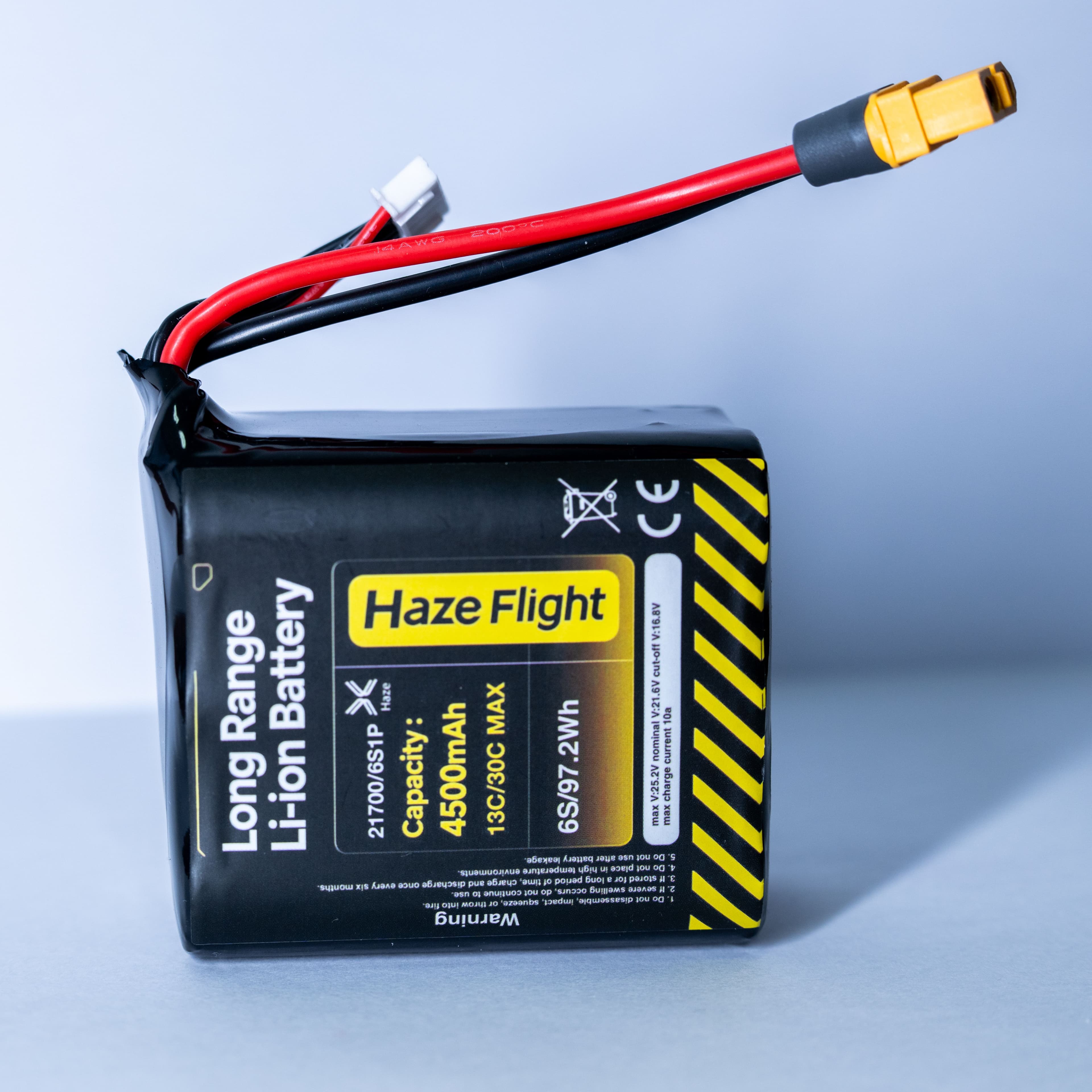 Designed by HazeFlight, specialists in drone development and RC power systems, this 6S1P 21700 battery pack utilizes brand-new BAK 45D high-rate cells. Optimized specifically for our FPV drone and fixed-wing aircraft models, it delivers a rated capacity of 4500mAh and a continuous 20C discharge rate. It perfectly balances explosive power and extended flight time, making it the ideal energy source for long-range cruising, racing, and endurance flights.