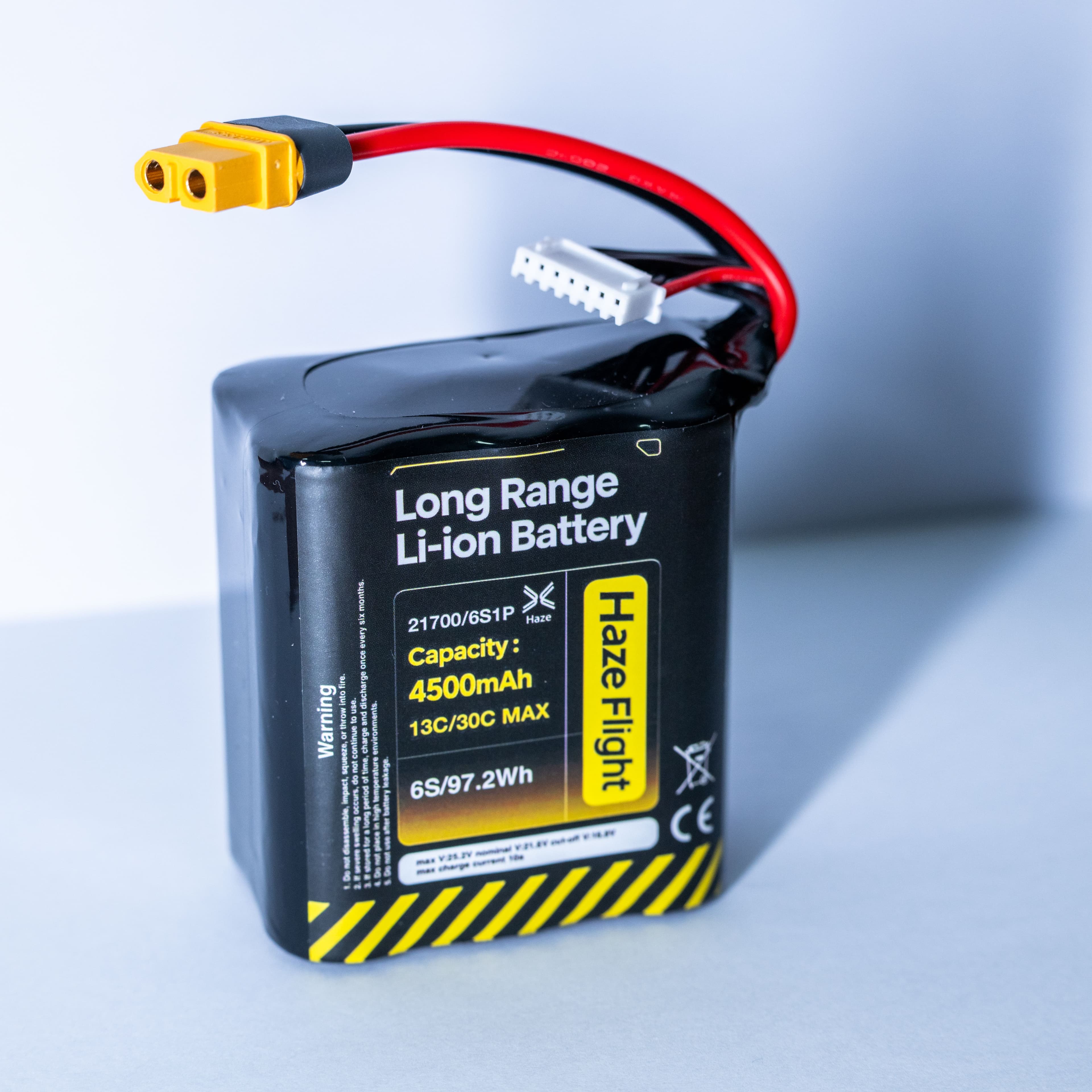 Designed by HazeFlight, specialists in drone development and RC power systems, this 6S1P 21700 battery pack utilizes brand-new BAK 45D high-rate cells. Optimized specifically for our FPV drone and fixed-wing aircraft models, it delivers a rated capacity of 4500mAh and a continuous 20C discharge rate. It perfectly balances explosive power and extended flight time, making it the ideal energy source for long-range cruising, racing, and endurance flights.