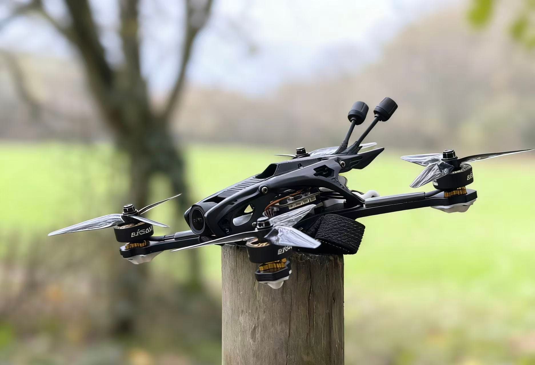 Motor mounting supports 16×16 mm and 19×19 mm patterns and accommodates motors in the 2207–2812 class, delivering strong thrust reserves for dynamic flying.